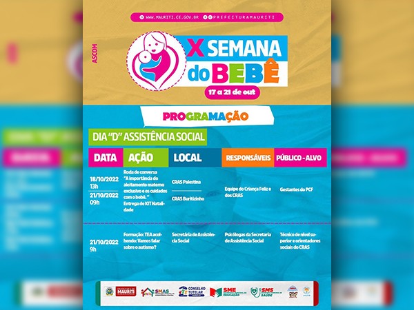 A Prefeitura de Mauriti, com a parceria do Fundo das Nações Unidas para a Infância (UNICEF), promove a X Semana do Bebê. Com início programado para o dia 17 de outubro, muitas atividades serão realizadas, envolvendo diversos setores do governo e da sociedade e ressaltando a importância do olhar especial para garantir o desenvolvimento pleno na primeira infância.